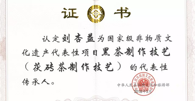 10月9日,益陽(yáng)市非物質(zhì)文化遺產(chǎn)項(xiàng)目國(guó)家級(jí)省級(jí)代表性傳承人證書頒發(fā)儀式在益陽(yáng)舉行,公司副總經(jīng)理劉杏益榮獲第五批國(guó)家級(jí)非物質(zhì)文化遺產(chǎn)代表性項(xiàng)目代表性傳承人、公司質(zhì)管部經(jīng)理黃燕榮獲第四批省級(jí)非物質(zhì)文化遺產(chǎn)代表性項(xiàng)目代表性傳承人。益陽(yáng)茯磚茶制作技藝因其悠久的歷史文化、精湛的傳統(tǒng)技藝、獨(dú)特的品質(zhì)要求被列入國(guó)家級(jí)非物質(zhì)文化遺產(chǎn)保護(hù)名錄。