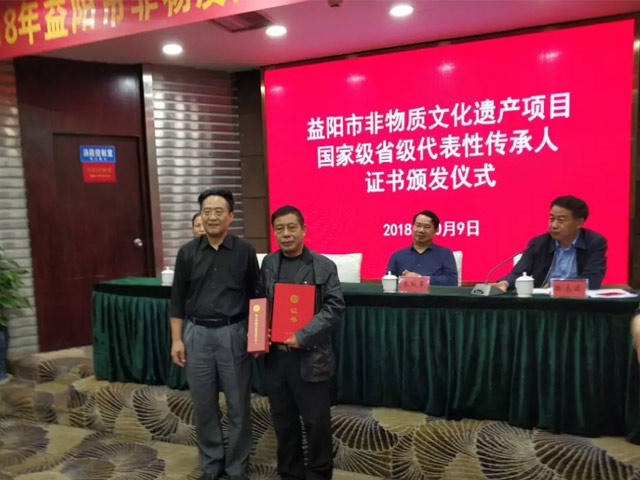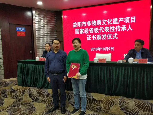 圖為湖南省文化廳非物質(zhì)文化遺產(chǎn)項(xiàng)目處竇雪松處長(zhǎng)為劉杏益頒發(fā)證書