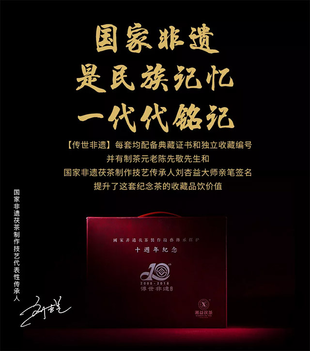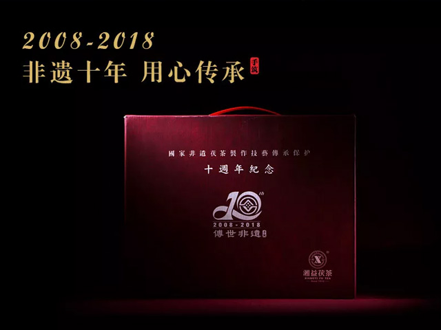 為隆重紀(jì)念茯磚茶制作技藝列入國(guó)家非物質(zhì)文化遺產(chǎn)保護(hù)名錄十周年,作為此制作技藝唯一傳承保護(hù)單位,益陽(yáng)茶廠有限公司現(xiàn)特別推出【傳世非遺】紀(jì)念茶組合限量收藏禮盒套裝。
