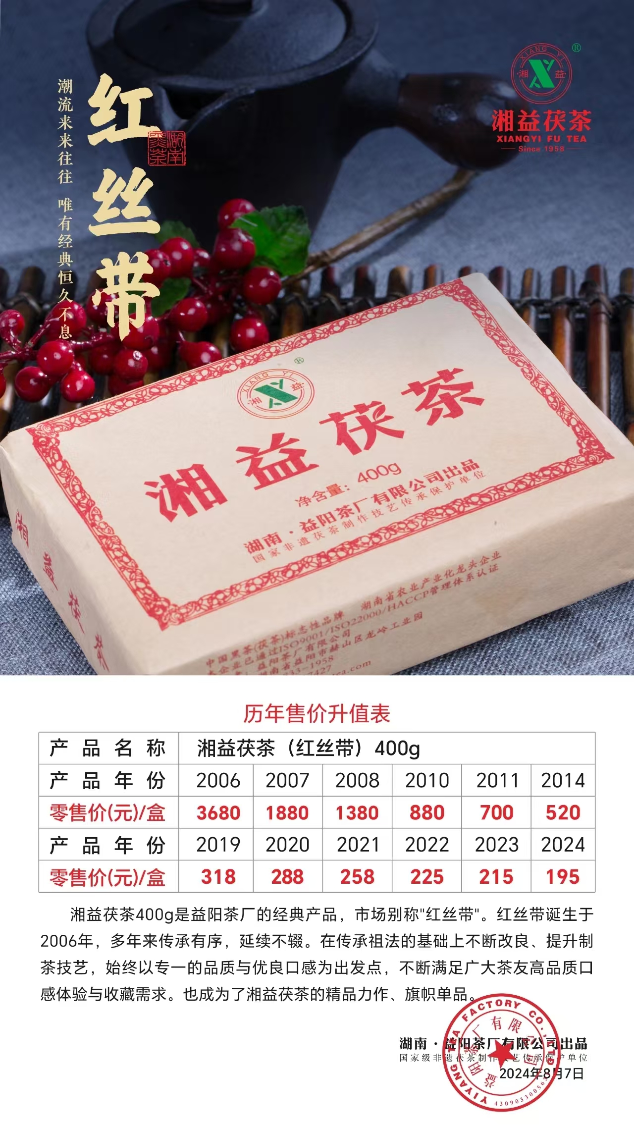 紅絲帶誕生于2006年,多年來傳承有序,延續(xù)不輟。它延續(xù)的不僅僅只是產品,更是精益求精的品質與口感。湘益茶人在傳承祖法的基礎上不斷改良、提升制茶技藝,始終以獨特的品質工藝與優(yōu)良口感為出發(fā)點,不斷滿足廣大茶友高品質口感體驗與收藏需求。在制茶匠人數十年如一日的精雕細琢、茶友們日復一日年復一年的口感認證之下,紅絲帶成為了湘益茯茶的精品力作、旗幟單品。