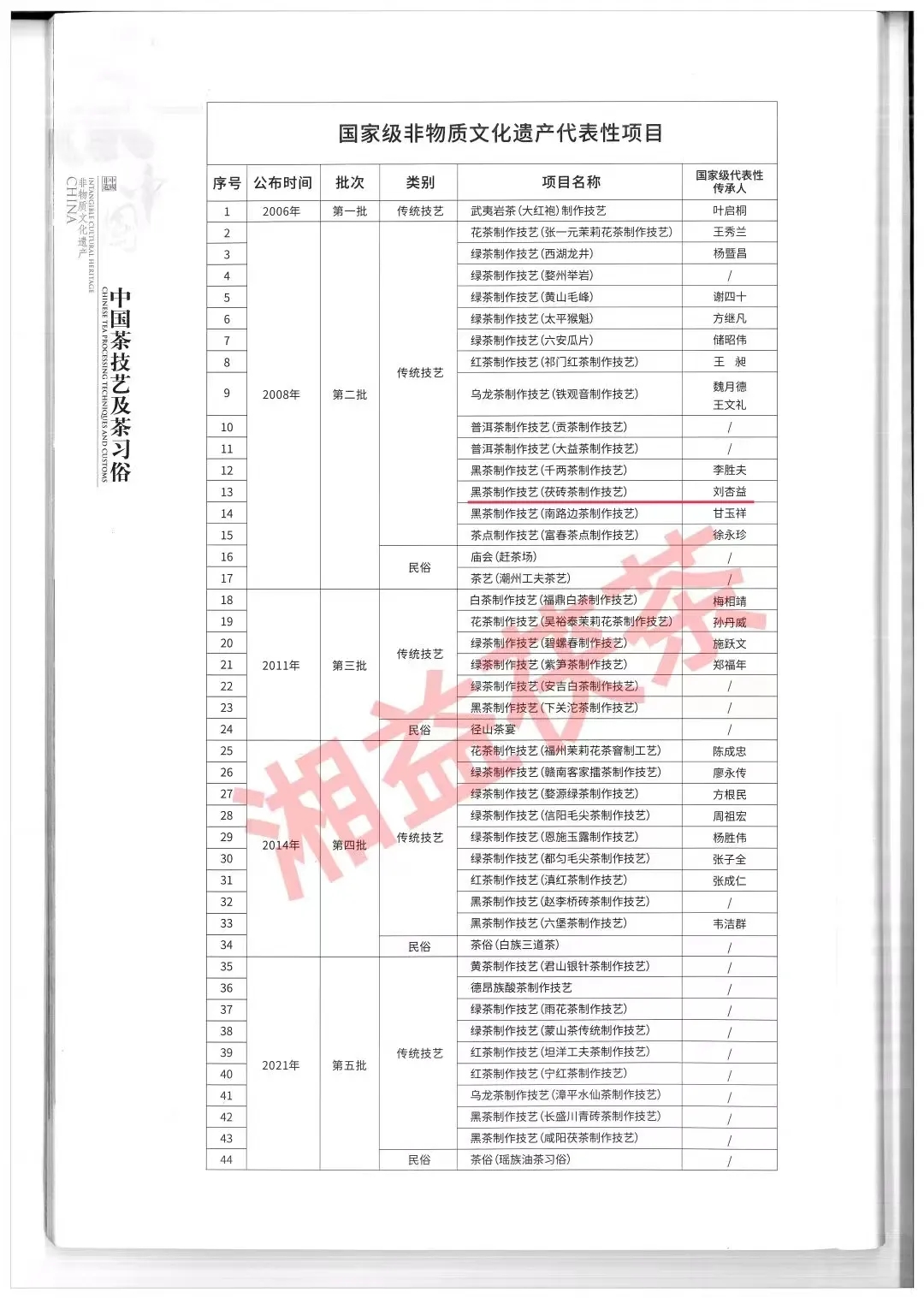 11月29日晚,我國(guó)申報(bào)的“中國(guó)傳統(tǒng)制茶技藝及其相關(guān)習(xí)俗”在摩洛哥拉巴特召開(kāi)的聯(lián)合國(guó)教科文組織保護(hù)非物質(zhì)文化遺產(chǎn)政府間委員會(huì)第17屆常會(huì)上通過(guò)評(píng)審,列入聯(lián)合國(guó)教科文組織人類(lèi)非物質(zhì)文化遺產(chǎn)代表作名錄。至此,我國(guó)共有43個(gè)項(xiàng)目列入聯(lián)合國(guó)教科文組織非物質(zhì)文化遺產(chǎn)名錄、名冊(cè),居世界第一。益陽(yáng)茯磚茶制作技藝也被列入其中。 “中國(guó)傳統(tǒng)制茶技藝及其相關(guān)習(xí)俗”是有關(guān)茶園管理、茶葉采摘、茶的手工制作,以及茶的飲用和分享的知識(shí)、技藝和實(shí)踐。自古以來(lái),中國(guó)人就開(kāi)始種茶、采茶、制茶和飲茶。制茶師根據(jù)當(dāng)?shù)仫L(fēng)土,運(yùn)用殺青、悶黃、渥堆、萎凋、做青、發(fā)酵、窨制等核心技藝,發(fā)展出綠茶、黃茶、黑茶、白茶、烏龍茶、紅茶六大茶類(lèi)及花茶等再加工茶,2000多種茶品,供人飲用與分享,并由此形成了不同的習(xí)俗,世代傳承,至今貫穿于中國(guó)人的日常生活、儀式和節(jié)慶活動(dòng)中。