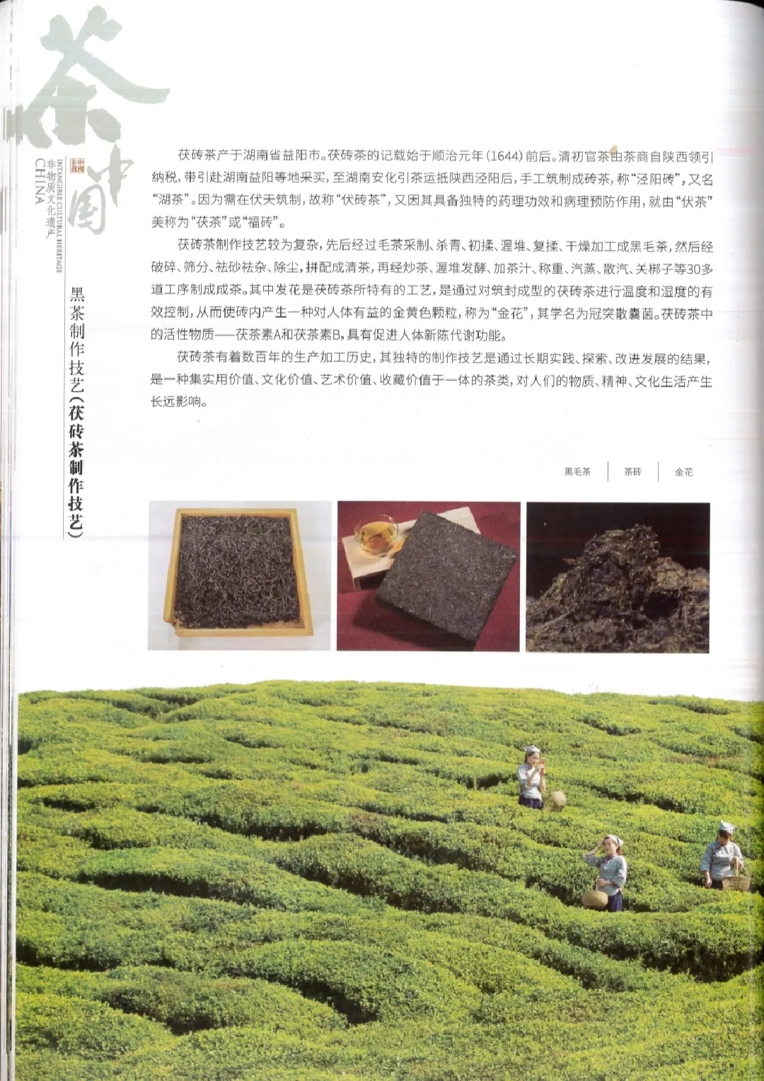 湖南黑茶是指采用湖南雪峰山脈泛區(qū)域茶葉為原料,在經(jīng)殺青、揉捻、渥堆、(復(fù)揉)、干燥等幾道工藝加工而成黑毛茶的基礎(chǔ)上再精制加工而成的黑茶成品。其品類(lèi)包括“四磚三尖一卷”,即茯磚茶、黑磚茶、青磚茶、花卷茶、天(貢、生)尖茶和千兩茶。其中尤以富含“金花”(冠突散蘘菌)的茯磚茶獨(dú)具特色。