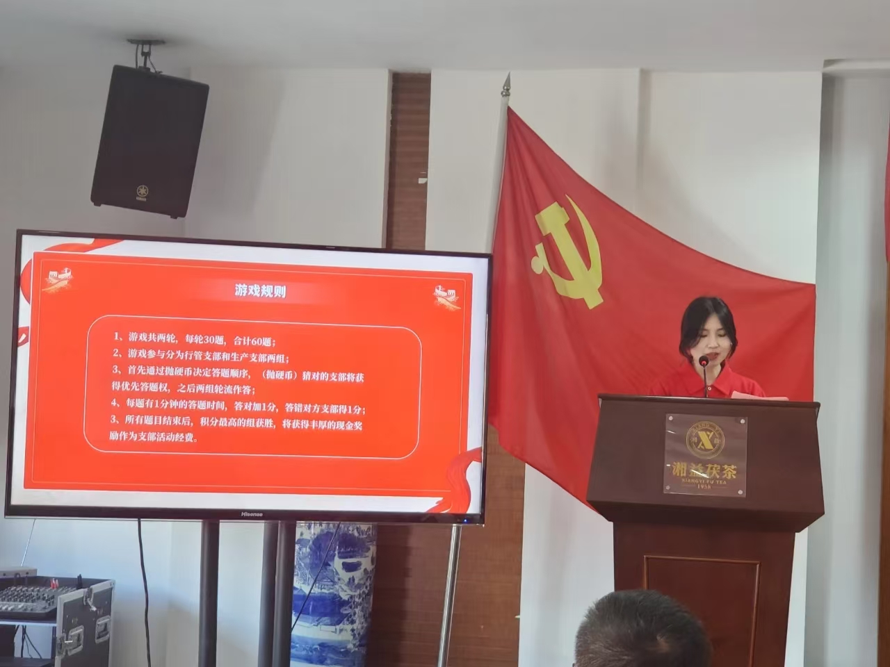 紅色知識與廠史知識問答環(huán)節(jié)開始,大屏幕上題目涵蓋黨的歷史、重要會議、革命英雄事跡及廠史知識。行政支部與生產(chǎn)支部黨員全神貫注答題,答對題目現(xiàn)場掌聲熱烈。黨員們鞏固黨性知識,加深對黨史廠史理解,認識到紅色政權(quán)、新中國、中國特色社會主義及單位發(fā)展成果來之不易。